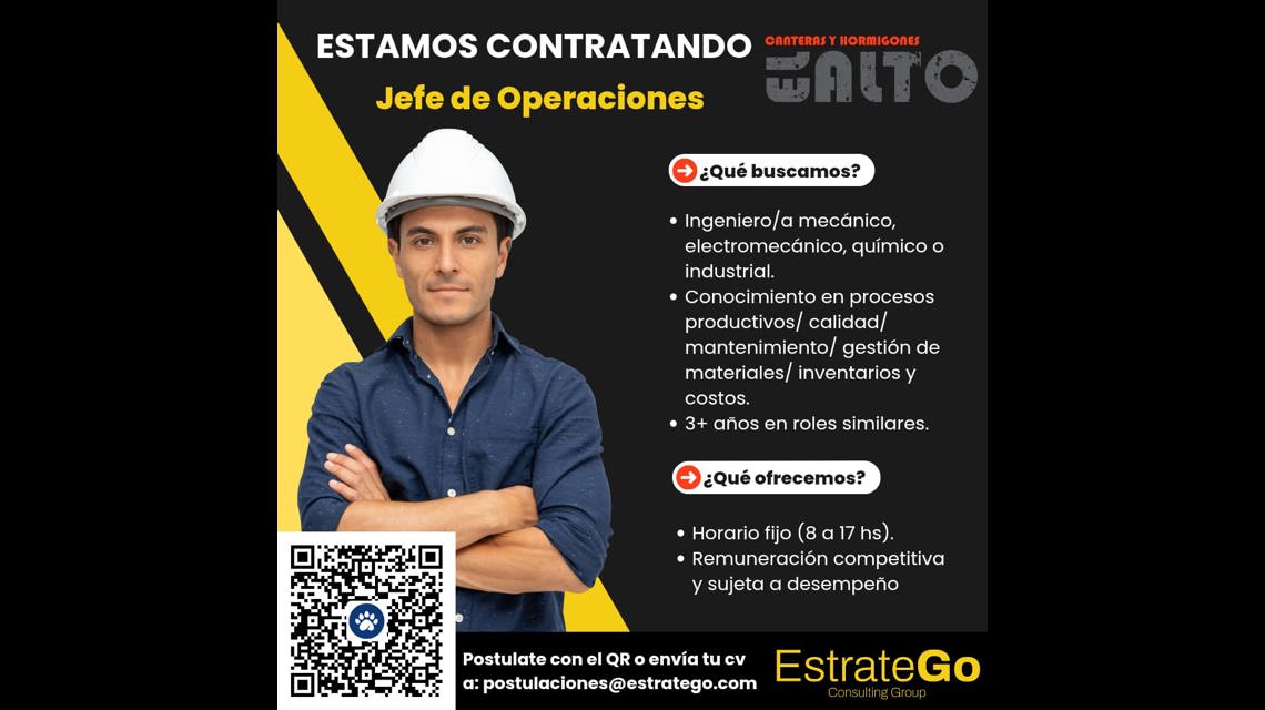 Somos un equipo que acompaña a las empresas a evolucionar, y te estamos buscando para dar el salto con Canteras El Alto, empresa con más de 40 años de historia especializada en hormigón elaborado y áridos de gran variedad granulométrica. Buscamos un Jefe de Operaciones proactivo y de liderazgo sólido, con dominio técnico en materiales de construcción, para guiar un equipo de 40 personas entre supervisores y operaciones. Será clave que pueda coordinar con Logística/Comercial/Administración/RRHH acciones conjuntas y maximizar el potencial del negocio en un ambiente familiar y comprometido con el cliente.